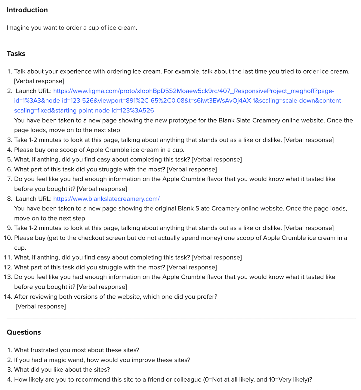 To understand if I had improved the website without biasing the individuals with the original website, I presented testers with the prototype first, and had them complete the task of ordering a scoop of ice cream.
