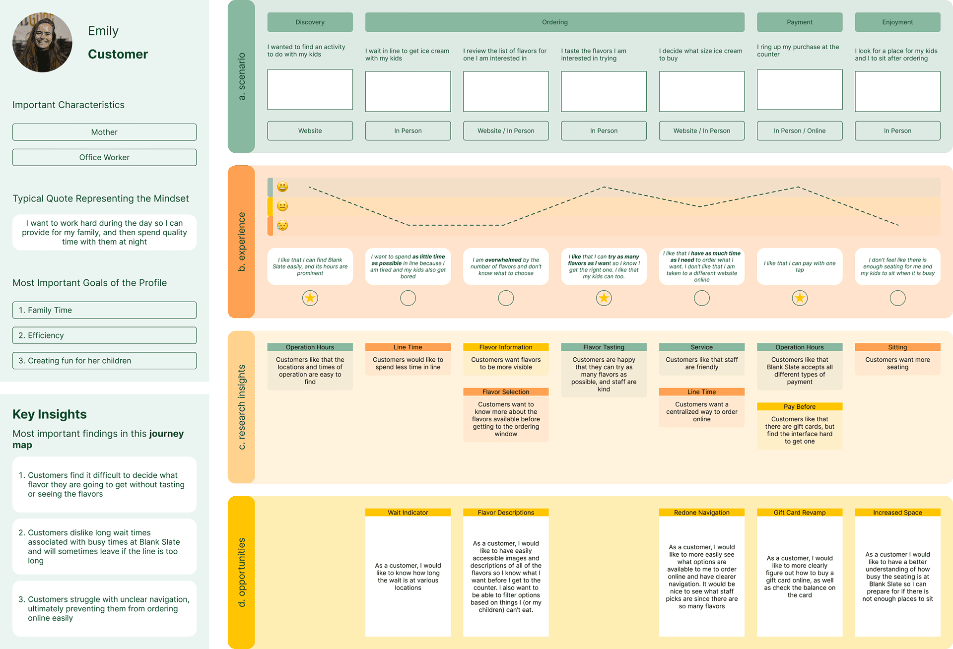 From my research, I discovered that the main pain point users were experiencing derived from an inability to understand the flavors Blank Slate had without trying them. Users were also unable to figure out how to order ice cream online. This lead to long lines, and customer frustration.