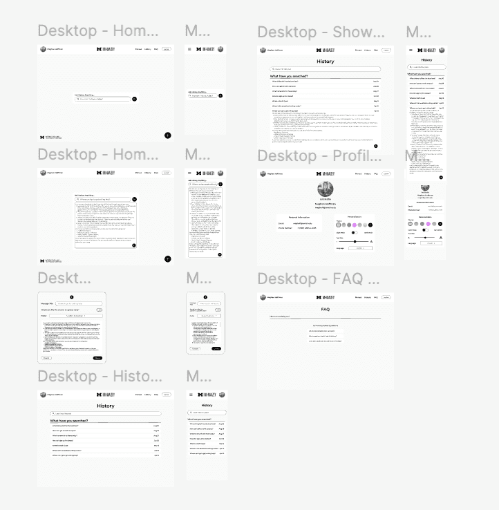After figuring out the important design requirements, I then went on to create wireframes for the product. This resulted in 6 pages that users could use to ask questions, save answers, and personalize their viewports.