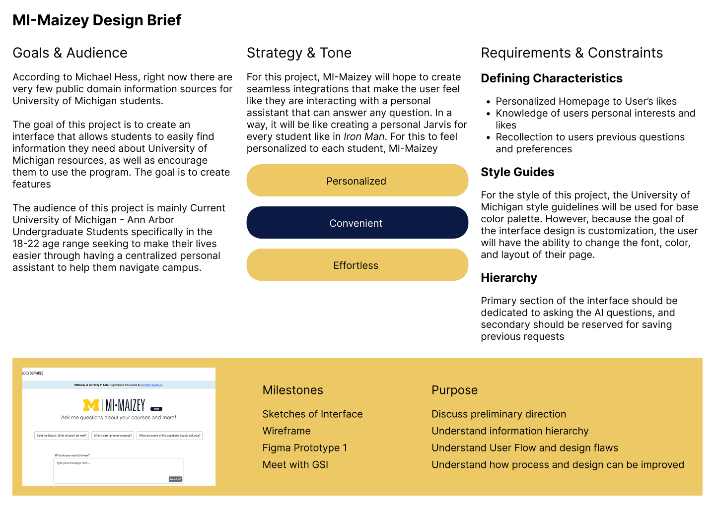 To begin this project, I first created a design brief that summarized the work that needed to be done on the interface. For this project, I discovered that the key stakeholders were the students at the University of Michigan who would be using Mi•Maizey in their everyday lives to find information on campus. Because of student's fast paced lives, I wanted to make sure that the interface was personalized, convenient, and effortless, to ensure minimal friction as they went throughout their days.