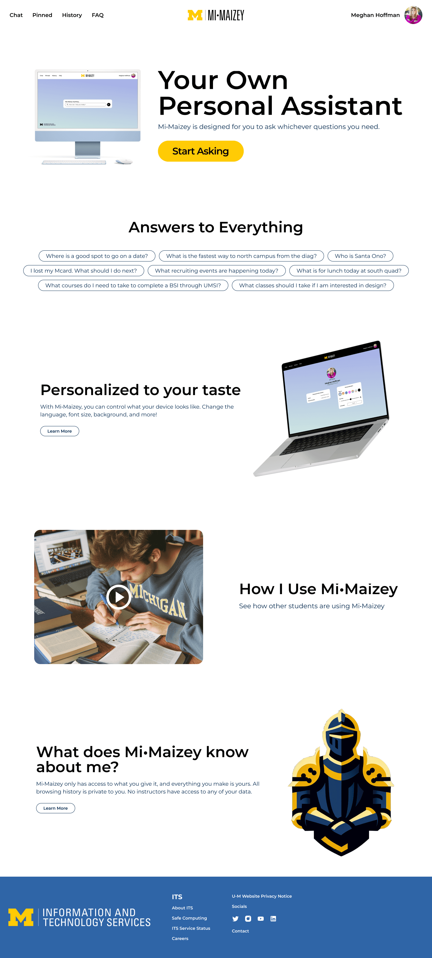 In order to make sure students were able to find Mi•Maizey and understand how to use it, the next task I took on was creating a landing page that explained how the application worked, as well as what types of prompts users could ask the system. I also wanted to include a privacy information section, to help showcase that Mi•Maizey did not keep users' personal information.