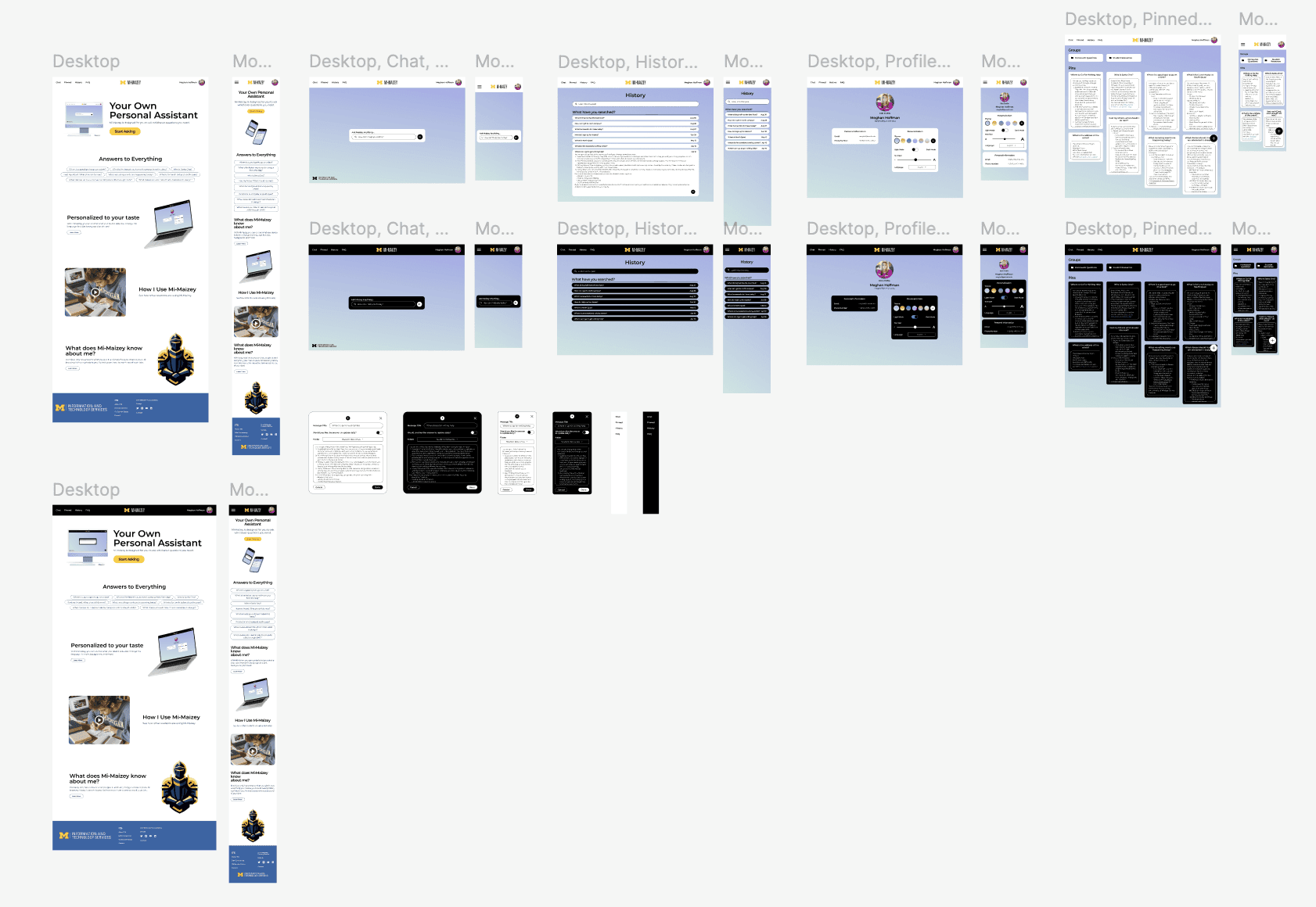 Finally, for this project I implemented the University of Michigan's design system components into my wireframes to fit University of Michigan guidelines. I also created dark and light views to emphasize the customization of the pages for users.